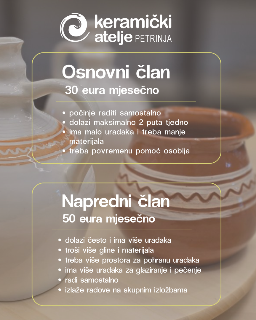 Do sada je članstvo u ateljeu bilo besplatno. Kako se naše aktivnosti stalno povećavaju, a keramički materijali su sve skuplji, došli smo do trenutka kada moramo uvesti članarine i tako osigurati održivost ateljea za godine koje su ispred nas.