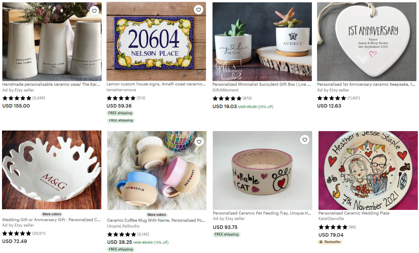 Uobičajeno je da svi kreativci koji izrađuju keramiku eksperimentiraju s dizajnom i cijenama kako bi se naučili dobro pozicionirali na tržištu, odredili fer cijenu i najbolje prodavali svoje rukotvorine. Ne zaboravite, kada netko želi kupiti premet po narudžbi, recimo ime drage osobe na šalici – to dodatno naplatite. Na Etsy-ju se takvi proizvodi jako dobro prodaju. Neko želi posebno ime na šalici ili neki tekst, roditeljima je fora kada im dijete jede doručak iz zdjelice na kojem piše njegovo ime, neko želi gostima na svom vjenčanju pokloniti keramičke predmete, netko naruči keramičko srce za mamin rođendan… Kako su kućni ljubimci postali dio obitelji, i za njih se često naruče posebne zdjelice. U donjoj fotografiji pogledajte primjere takvih predmeta s navedenim cijenama. Cijene su izražene u dolarima, ali vrijednost dolara i eura je približna pa to ne bi trebao biti problem.